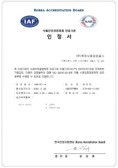 지난 3월 26일 국제식품안전공사(대표 정현아)는 한국인정지원센터(대표 윤상재)로부터 ISO 경영시스템 경영체제 인증기관으로 인정되었습니다.